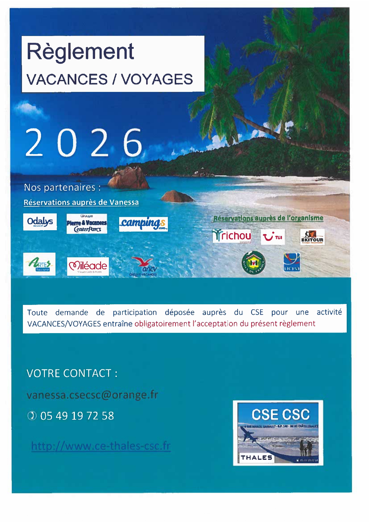 Votre Comité, soucieux d’apporter une dimension sociale à ses activités vacances/voyages, a sélectionné des organismes qui permettent d’obtenir des droits de réservation prioritaires, des tarifs préférentiels, et pour lesquels un partenariat a été signé.